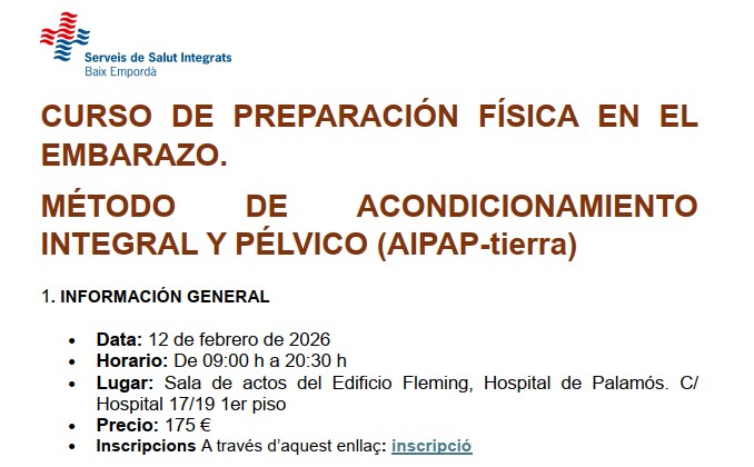 curso AIPAP TERRA EN PALAMOS 12 FEBRERO 2026 curso aipap palamos gavern_opengraph_title: CURSO AIPAP TERRA PALAMOS gavern_opengraph_desc: • Data: 12 de febrero de 2026 • Horario: De 09:00 h a 20:30 h • Lugar: Sala de actos del Edificio Fleming, Hospital de Palamós. C/ Hospital 17/19 1er piso • Precio: 175 € • Inscripcions A través d’aquest enllaç: inscripció